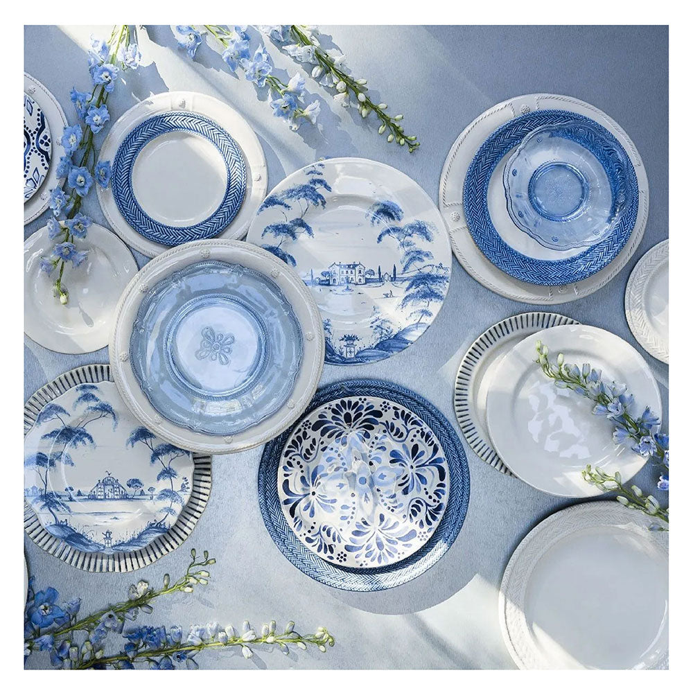 Rimmed with radiant stripes symbolizing the endless paths of awaiting journeys, this versatile dessert/salad plate is up for every culinary adventure, from morning to night. With a fresh whitewash glaze and Delft blue palette, mixing and matching with other collections - and infinite occasions - is a breeze.