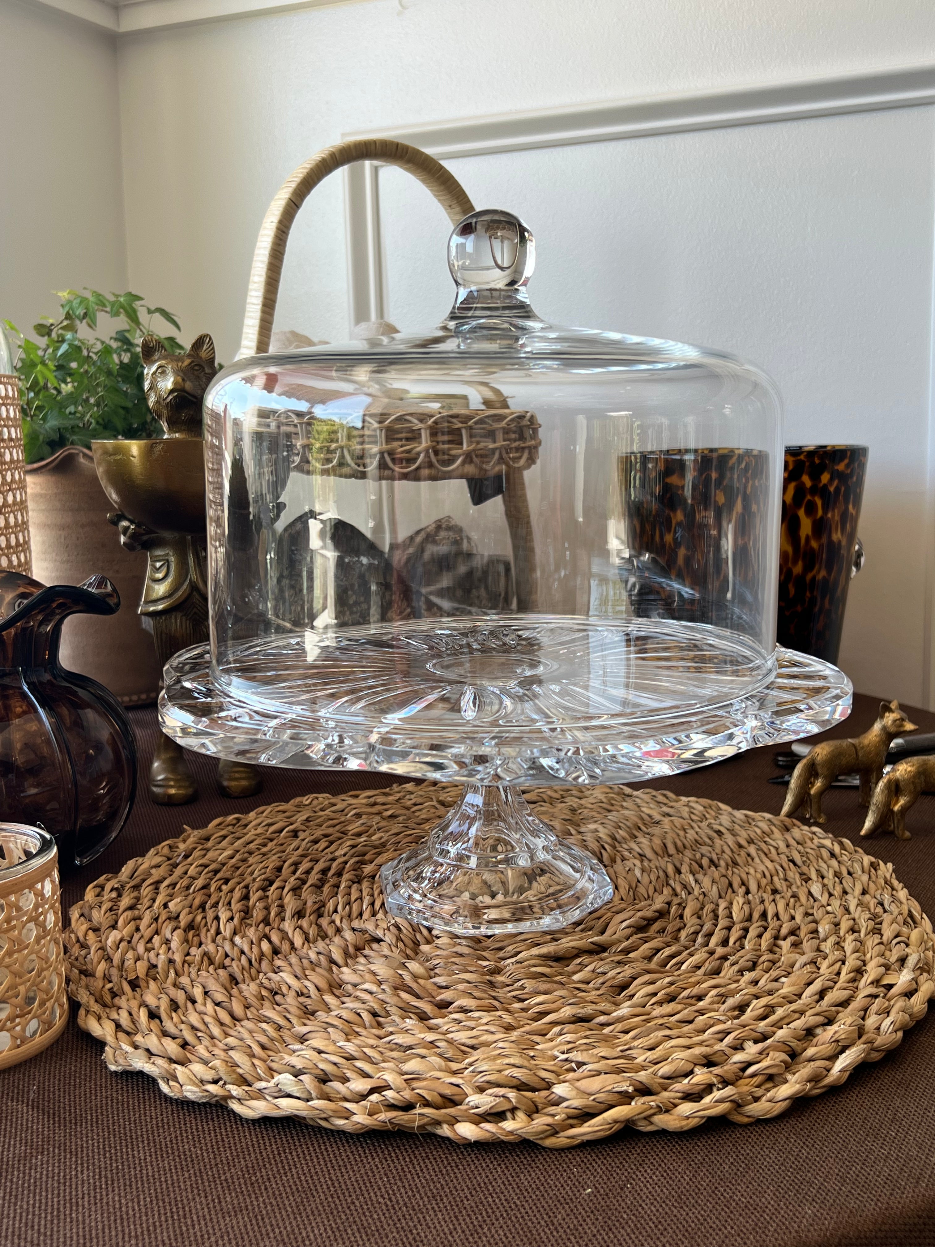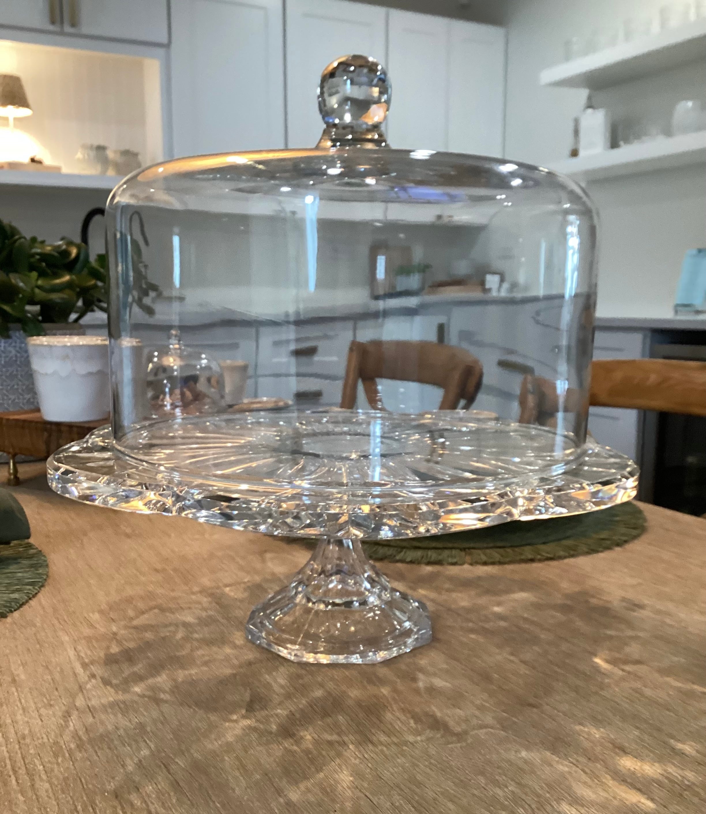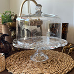 Clear glass cake dome designed to beautifully showcase and protect cakes, pastries, or cheeses. A timeless piece that pairs perfectly with a cake stand or can be styled on its own for elegant display.
