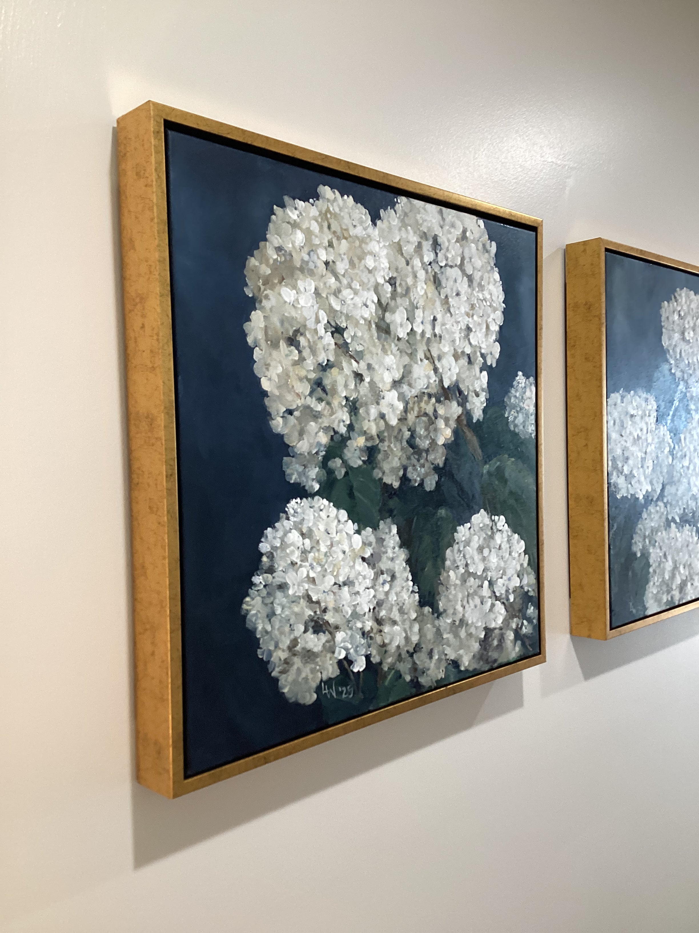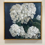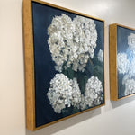 Original 20" x 20" oil painting by local artist Laurie Wienke, featuring a lush multi-stem hydrangea arrangement set against a deep, rich navy background. The bold florals are beautifully complemented by a classic 21" x 21" x 2" gold frame, making this piece a striking statement for any space.