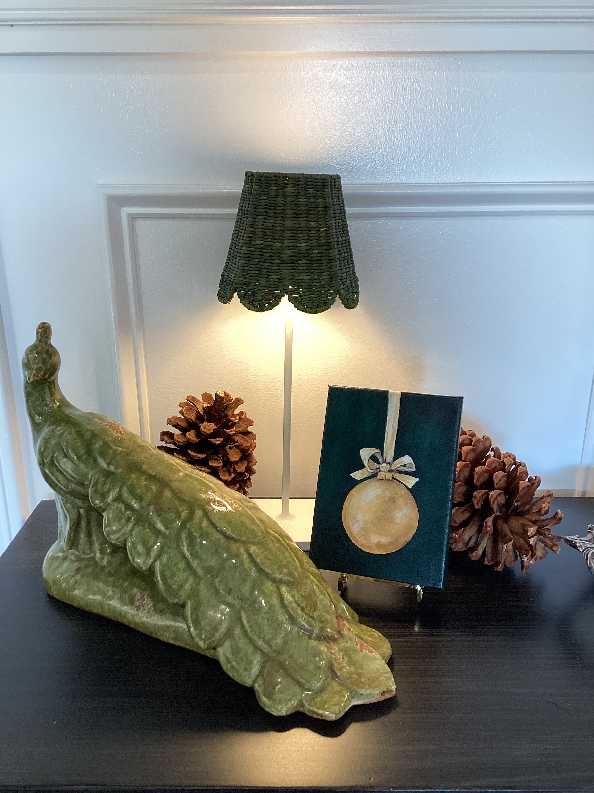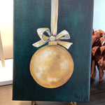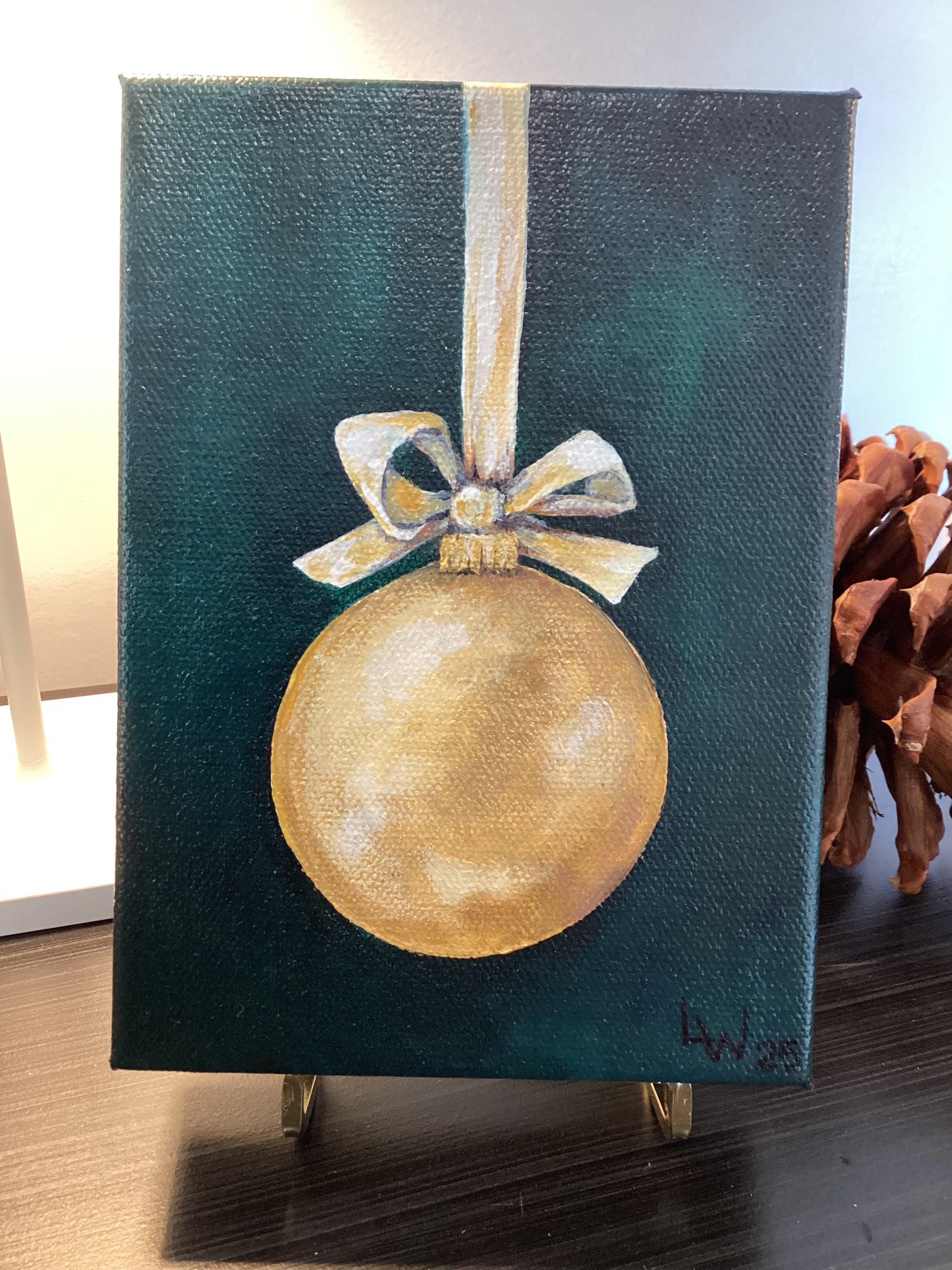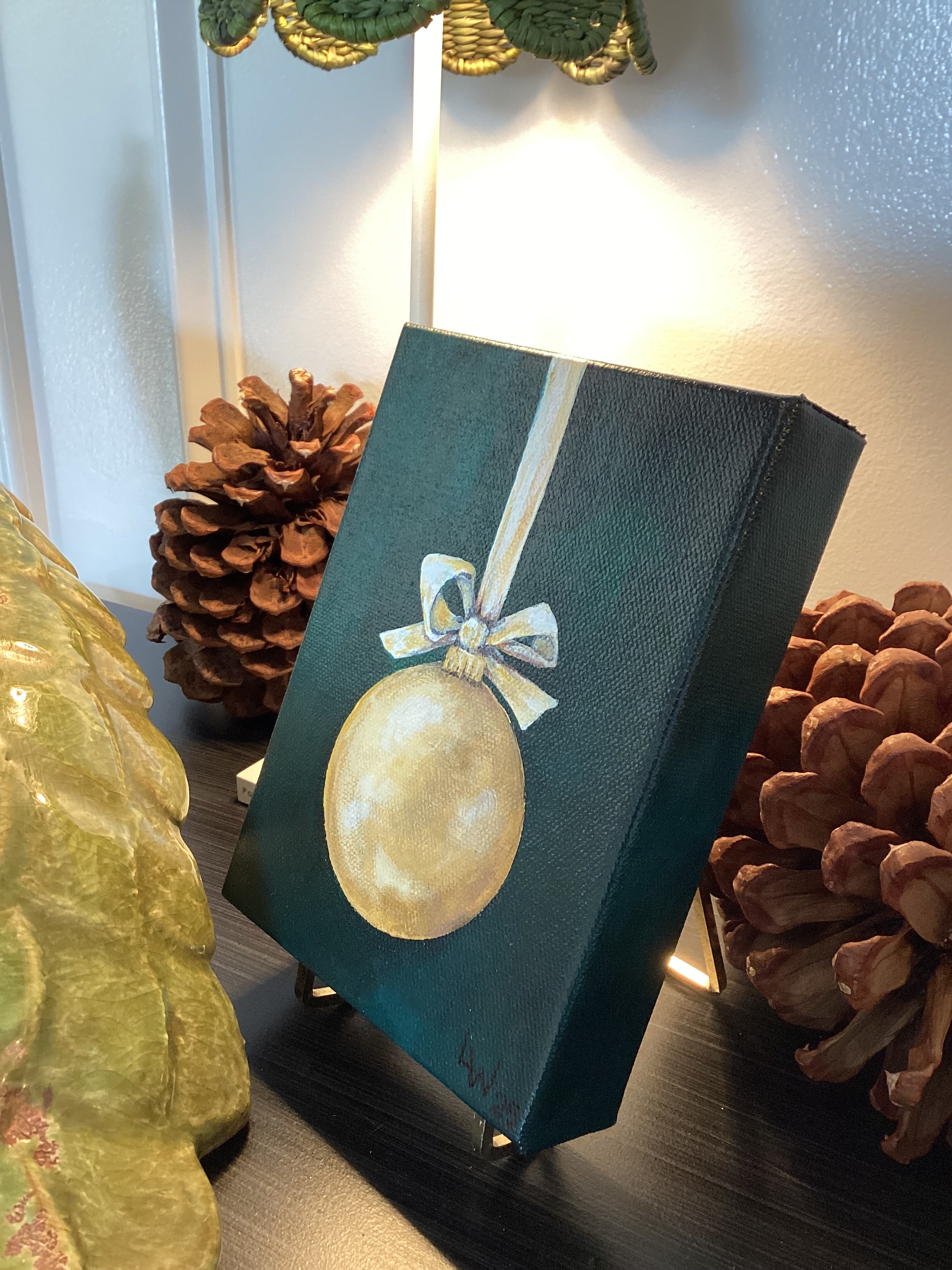 A luminous gold ornament shines against a deep green backdrop in this original acrylic painting by local artist Laurie Wienke. Painted on a 5" x 7" gallery-wrapped canvas with 1½" depth, this piece captures the warmth and elegance of the holiday season with rich texture and timeless simplicity.