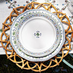 Classically pretty, the intricately painted rim of this plate is designed for layering or to stand alone, with its versatile palette of verdant greens and balmy blues upon a bright white background.