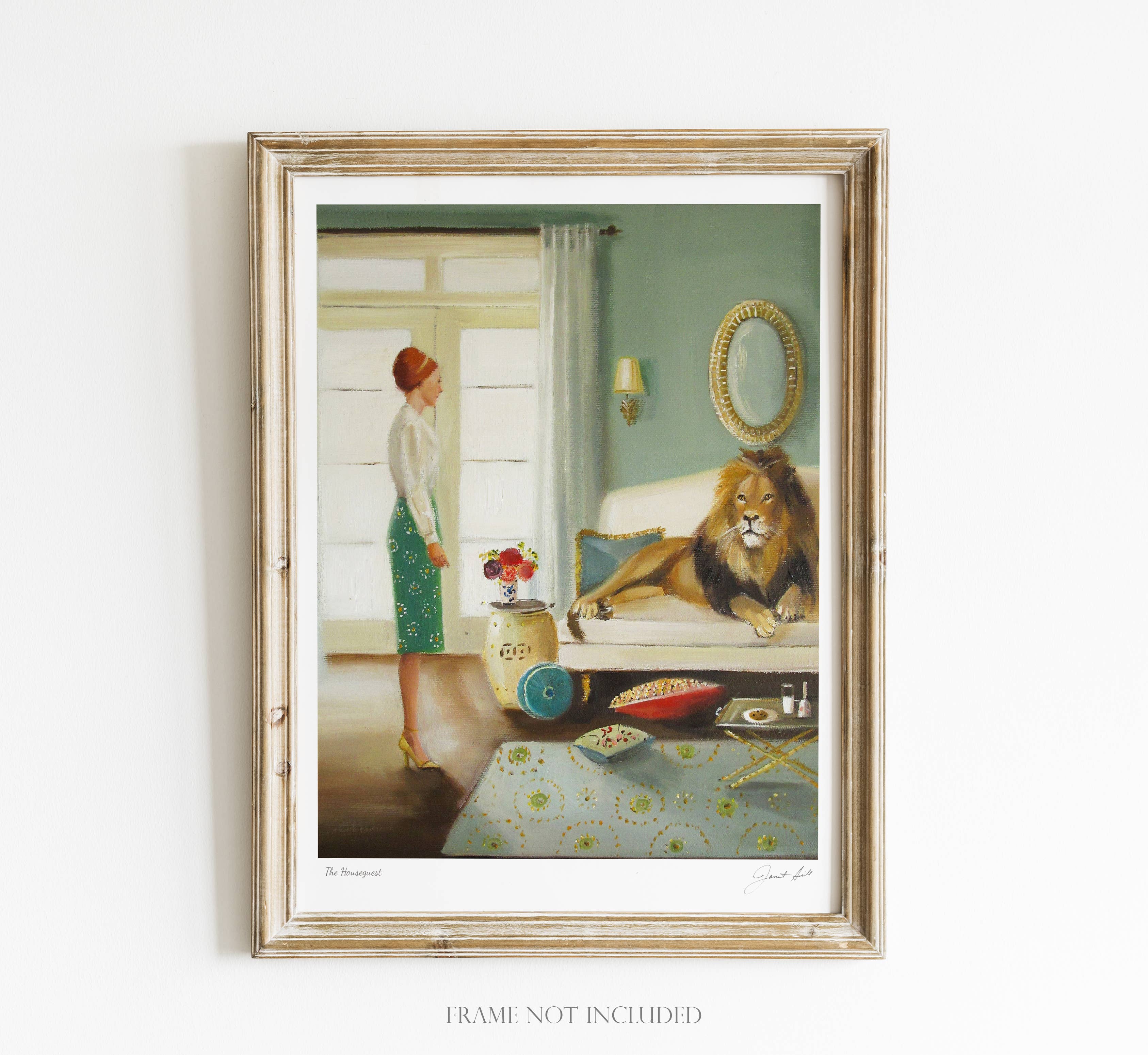 Title: The Houseguest Image size: Approximately 8"x10". Paper size: 8.5"x11". Printed using Epson Ultrachrome archival inks on heavyweight matte fine art paper ( 100% cotton rag). Important note: Frame not included. All prints are digitally signed and titled and come with an "Authentic Art Print" card. Prints are packaged with a lightweight chipboard backing for added stability.