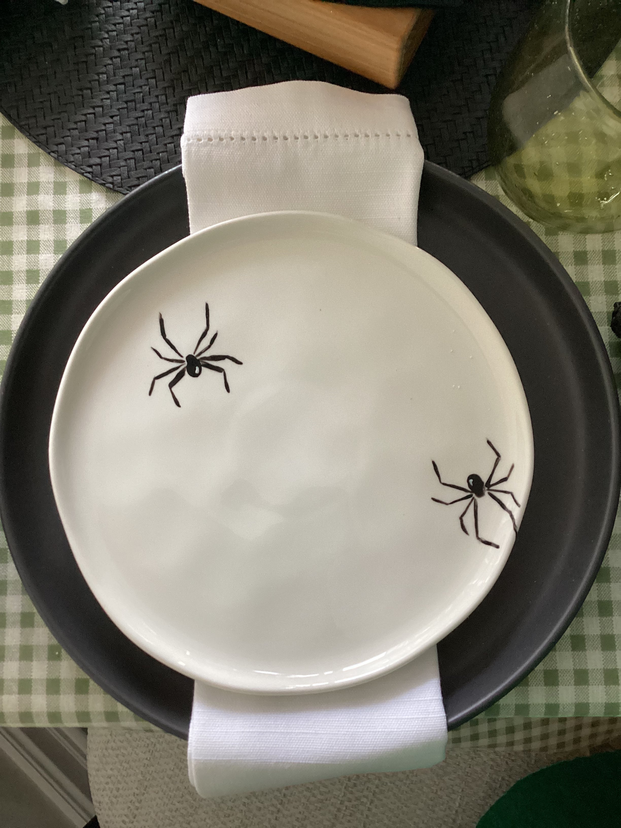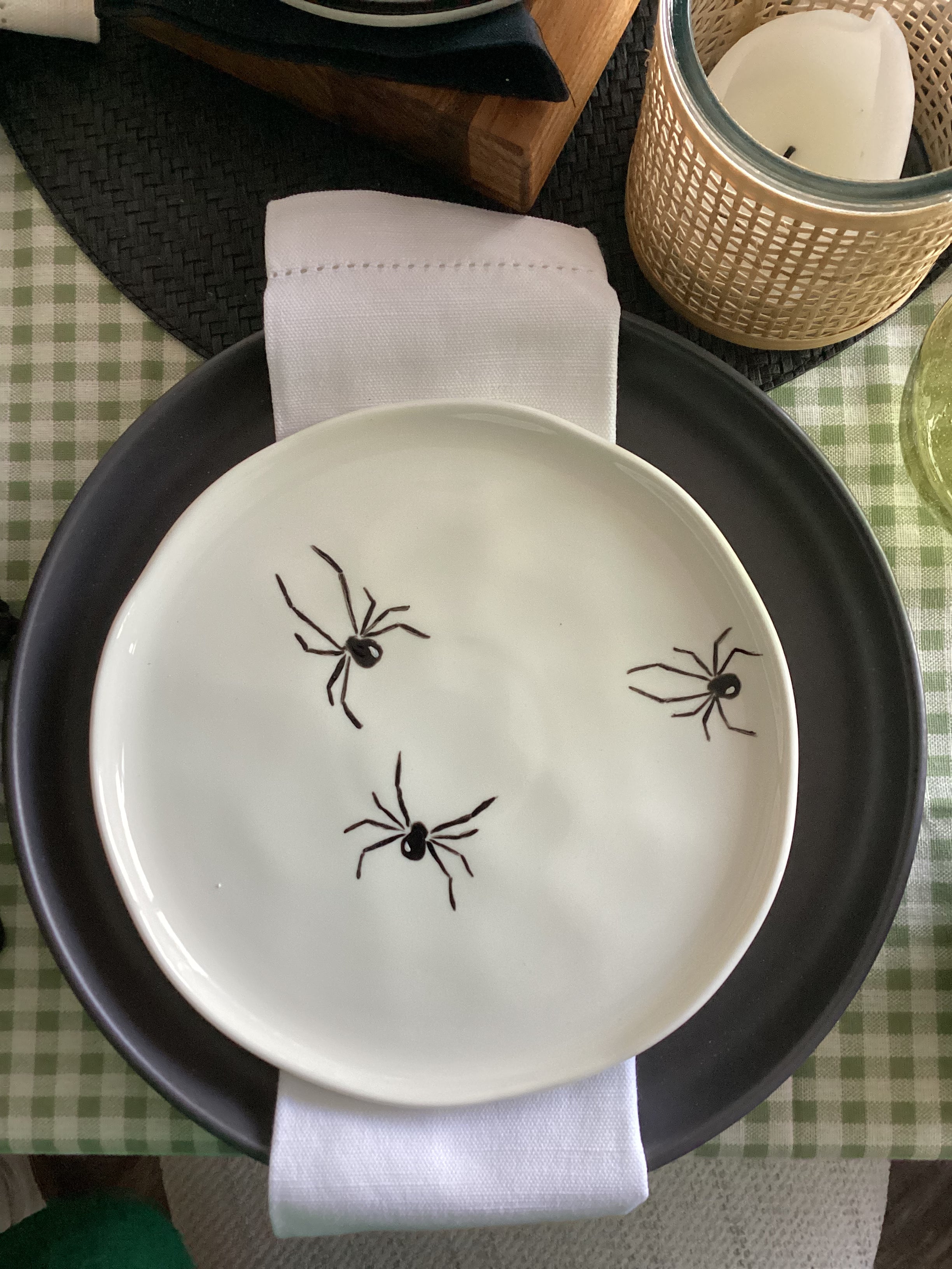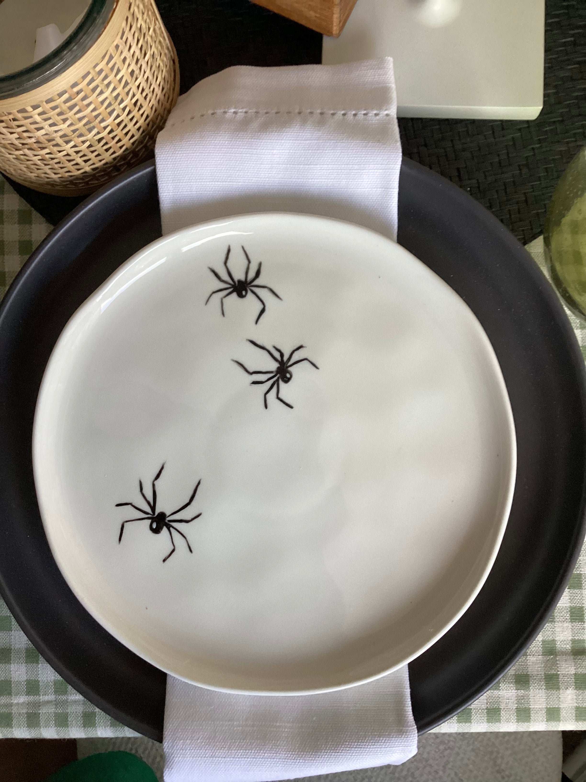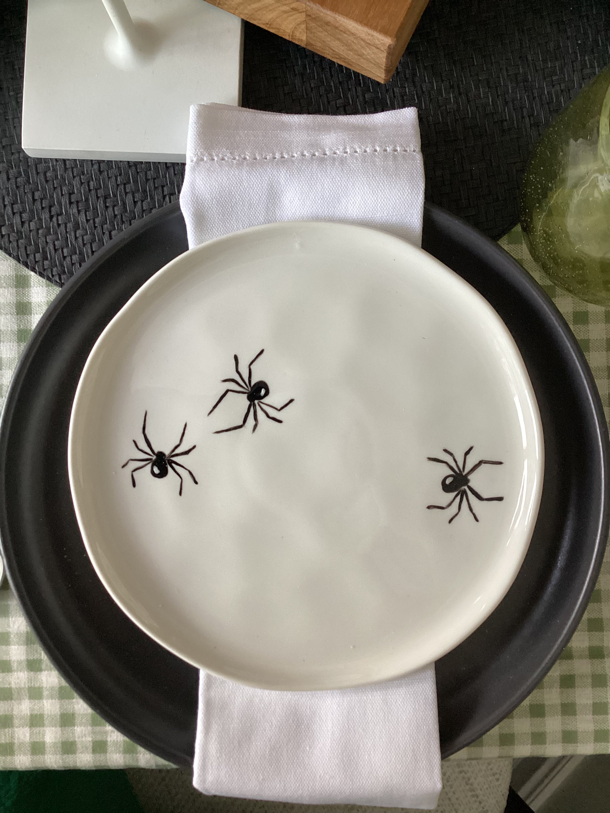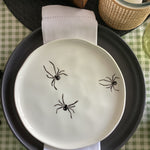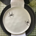 Hand-made & Hand-painted Porcelain spider plate — a fun and eye-catching accent for Halloween entertaining or for anyone who loves a touch of the unexpected in their décor. Hand wash only, use of knives with this product is not recommended.