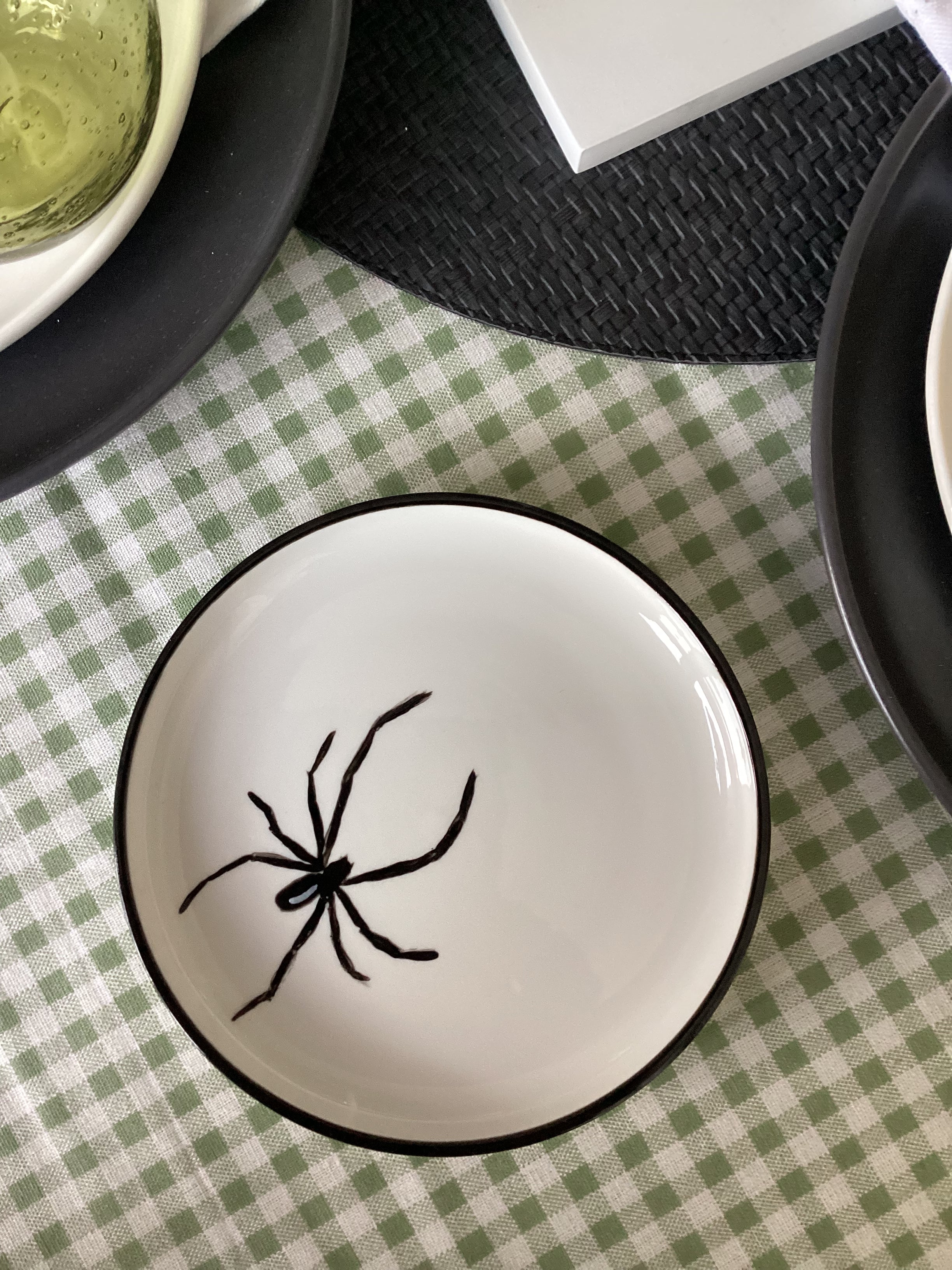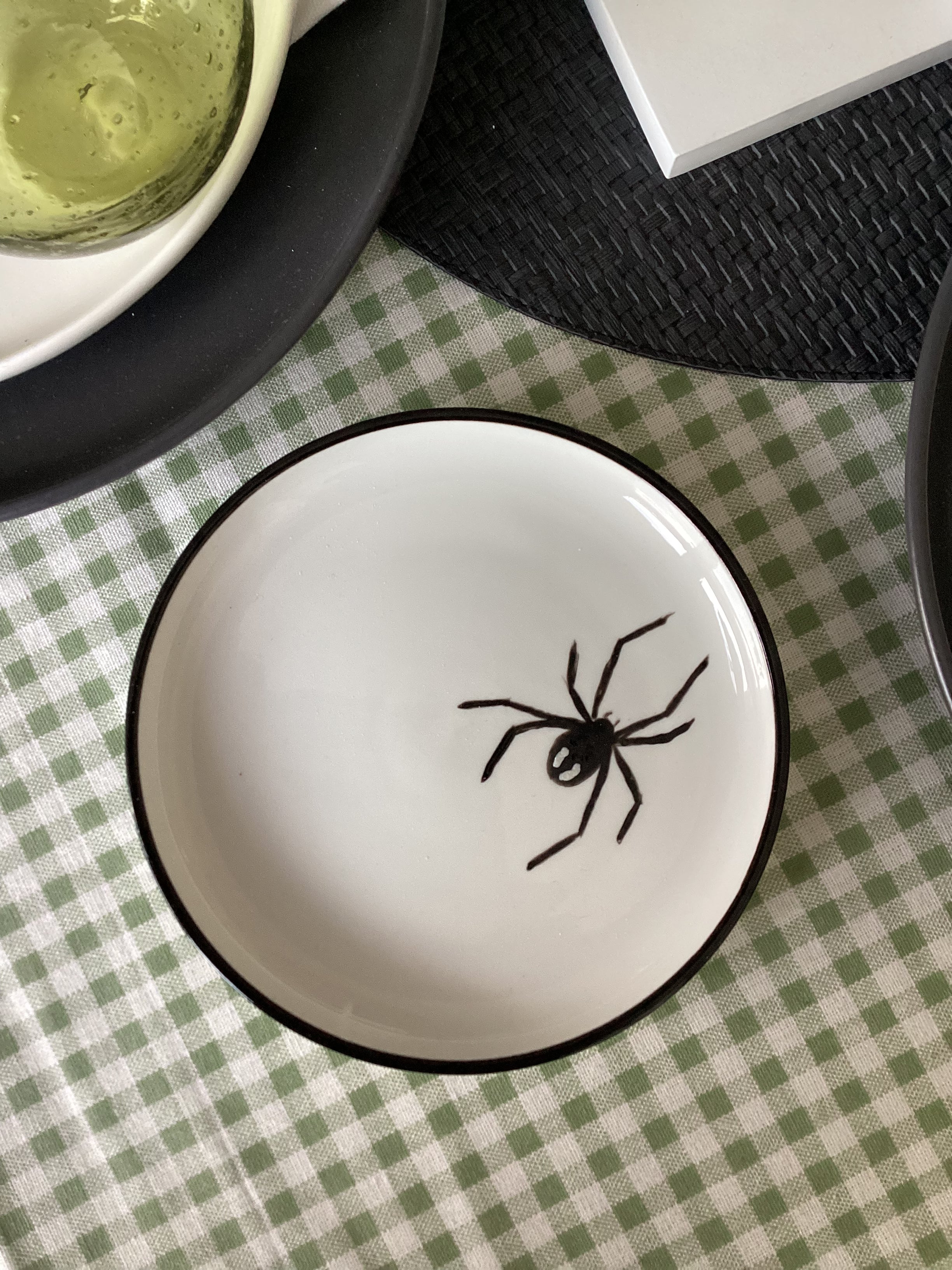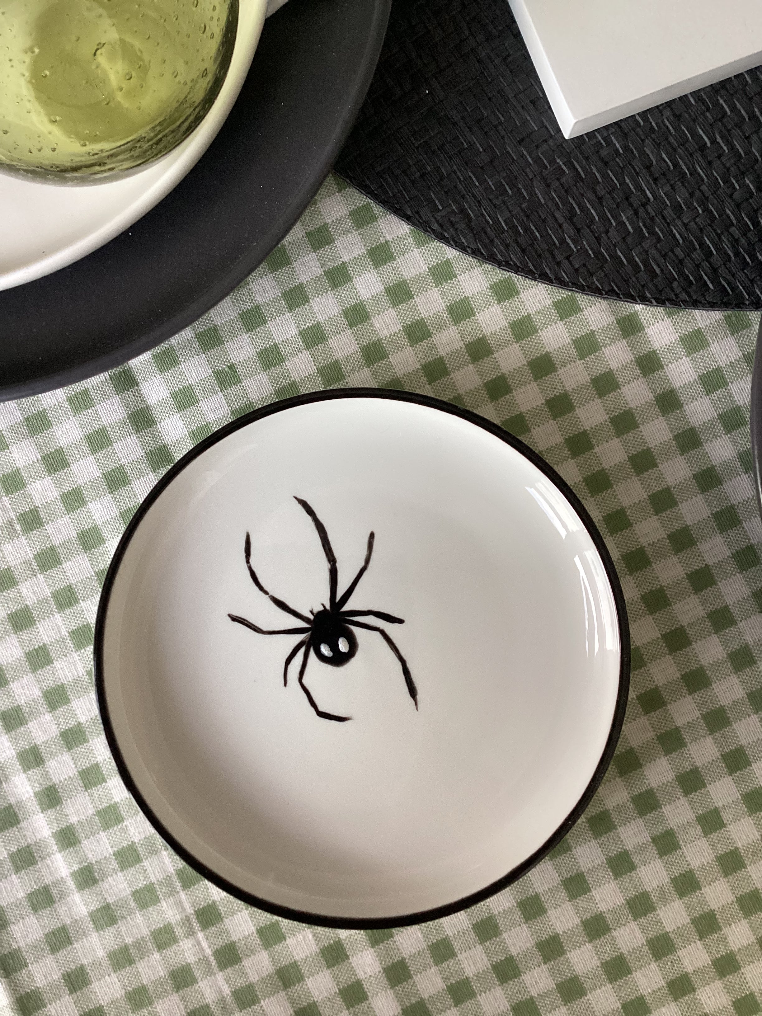 Hand-painted spider plate — a fun and eye-catching accent for Halloween entertaining or for anyone who loves a touch of the unexpected in their décor. Hand was only, use of knives with this product is not recommended.