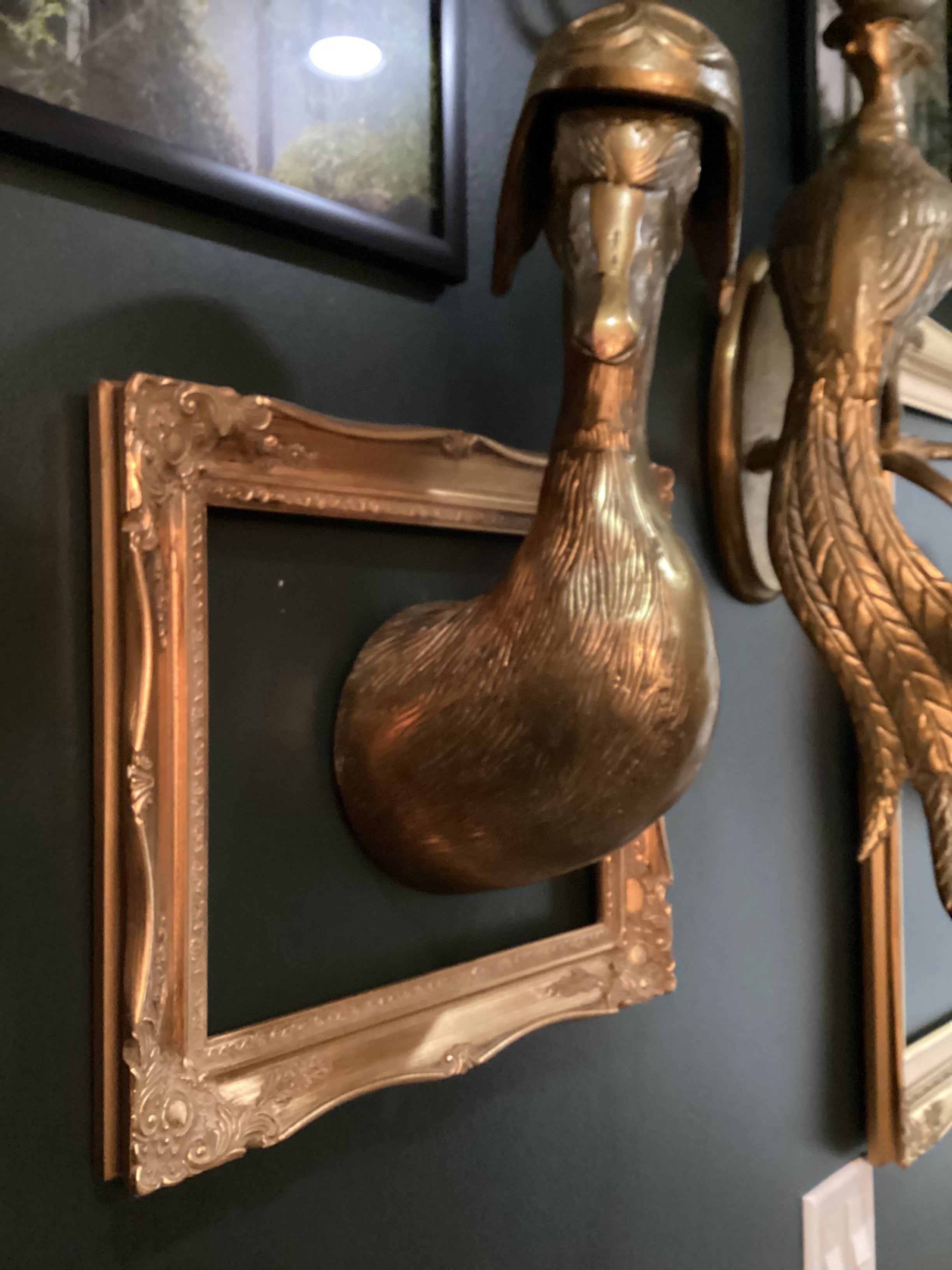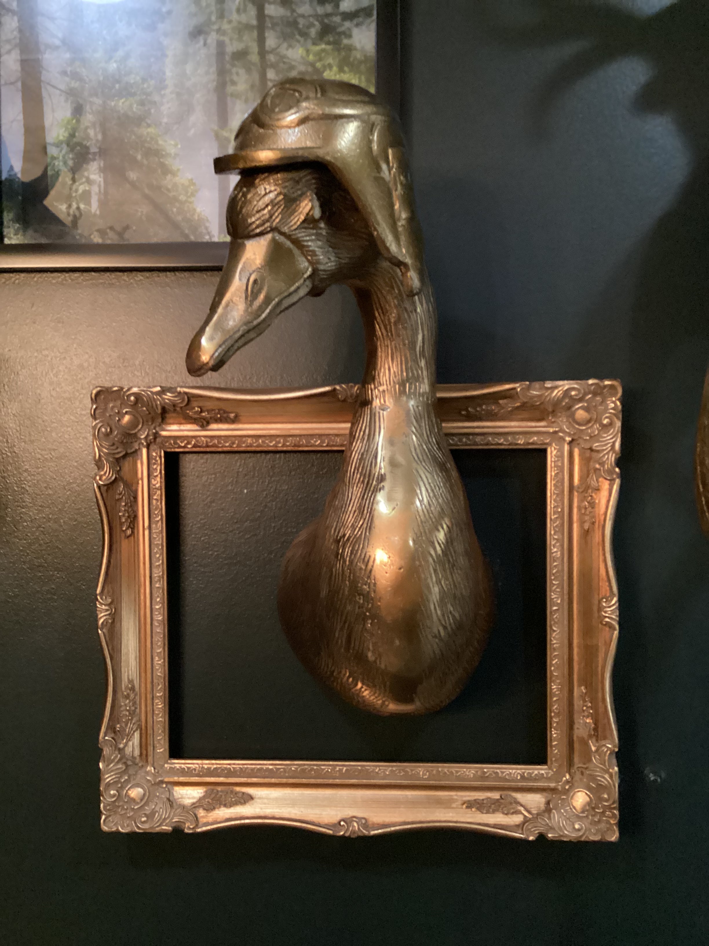 Vintage gold frame with ornate detailing, designed to beautifully showcase our Eric & Eloise wall mounts. Its warm golden finish adds a touch of elegance and whimsy, making your mount a true statement piece. (Can be hung vertically or horizontally)