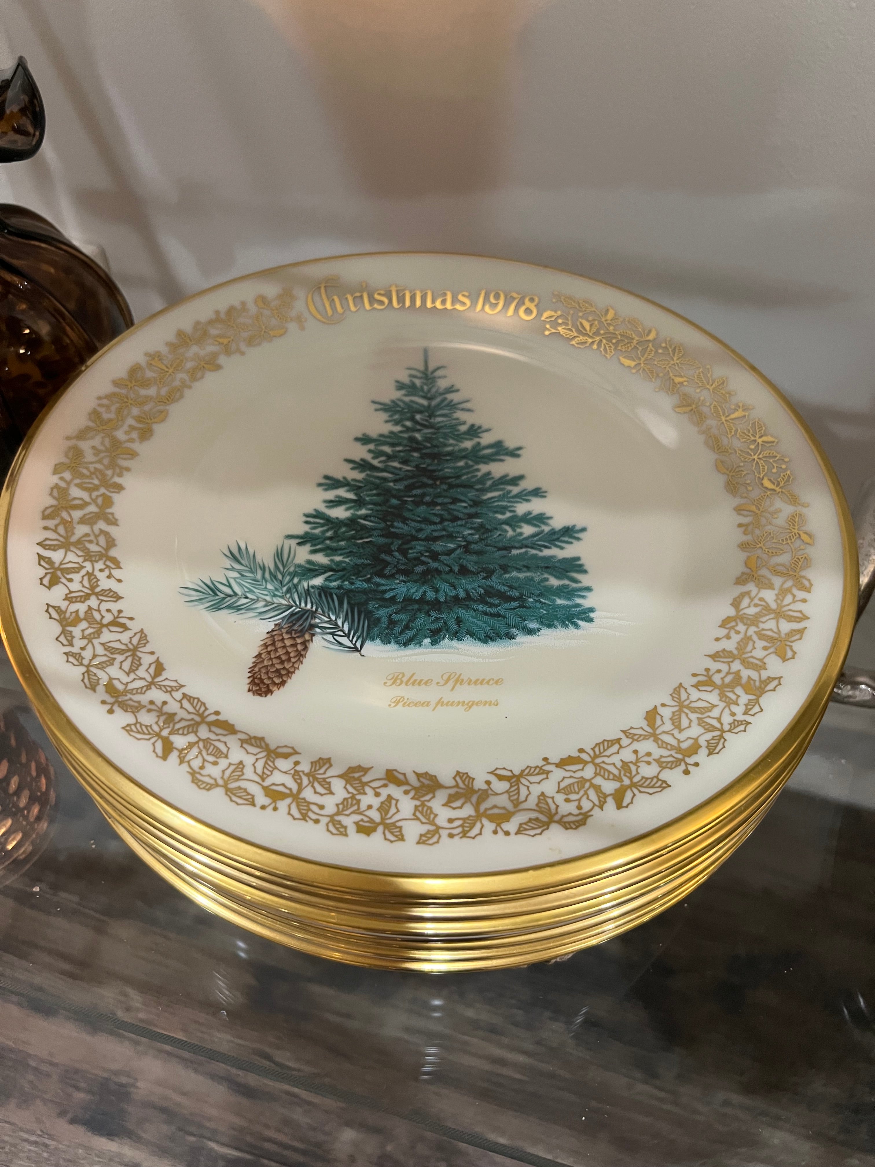 Each plate features its original year’s Christmas tree design, beautifully rendered with Lenox’s signature craftsmanship. The set is in excellent condition, with crisp artwork, vibrant color, and brilliant gold accents—an exceptional find for collectors and holiday enthusiasts alike.
